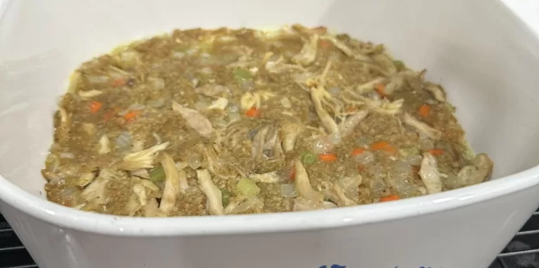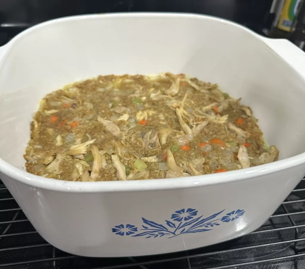 I call this chicken and stuffing bake a struggle meal because it only costs seventy cents per serving to make! All you need is a box of stuffing mix, your choice of dark or white meat from a rotisserie chicken, and any veggies you want to add. I added onions, carrots, and celery to mine, but feel free to get creative!